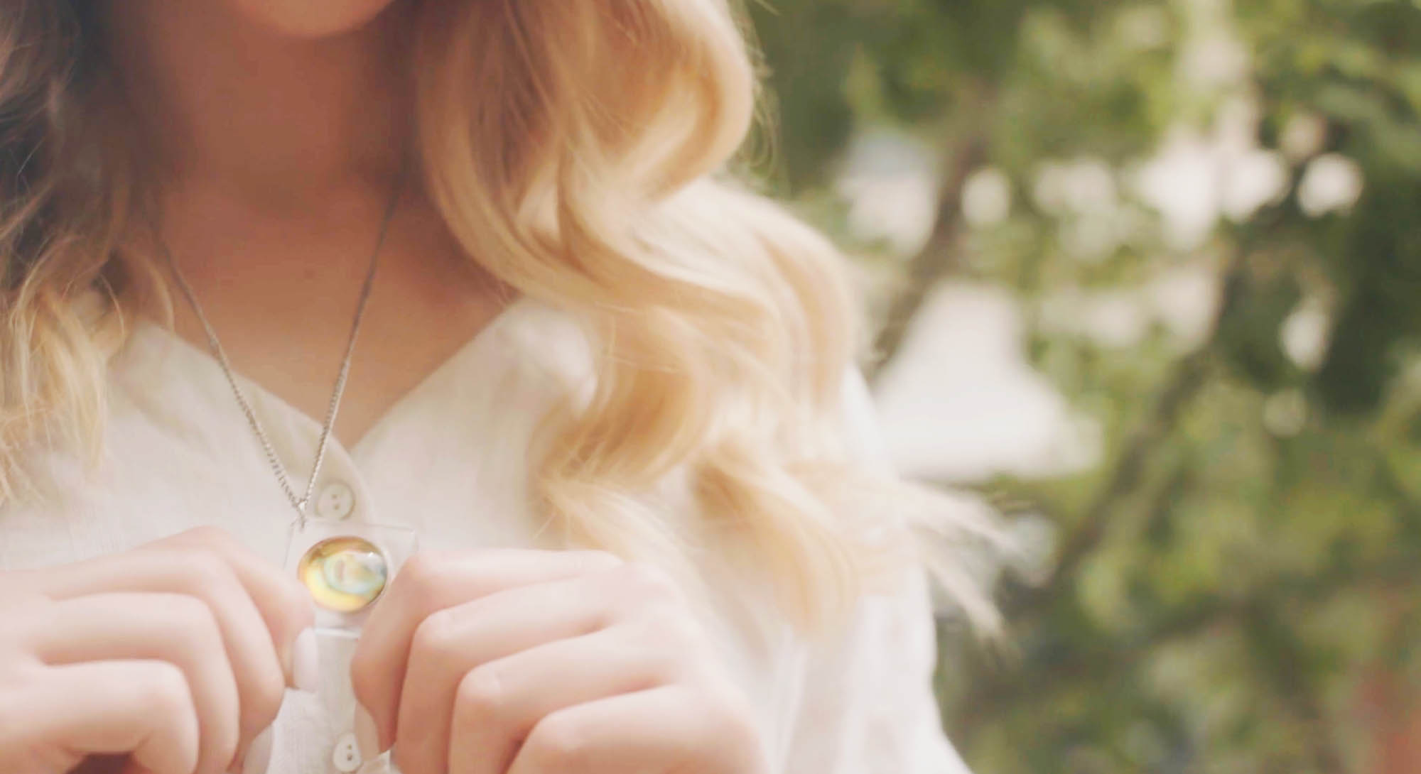 “The Liquid Crystal Necklace” — a heat-sensitive square that changes colors with just a touch